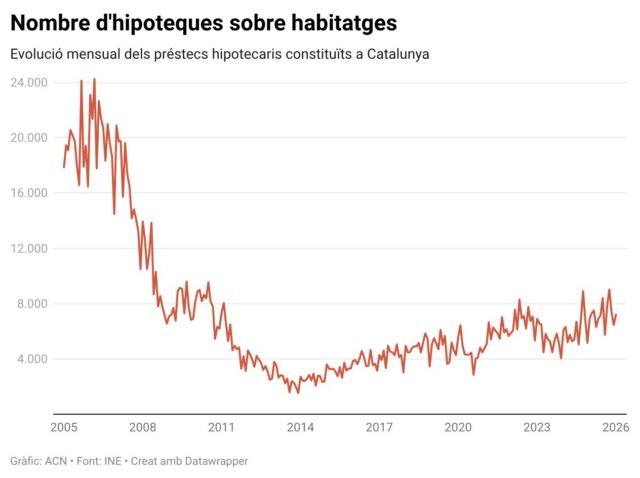 ACN Barcelona – Catalunya comença el 2026 amb 7.212 hipoteques sobre habitatge inscrites, la dada més alta d’un mes de gener des del 2011, quan n’hi va haver 7.366, i ja encadenen 20 mesos d’increments interanuals, segons les xifres que ha actualitzat l’Institut Nacional d’Estadística (INE) aquest dimarts. Les hipoteques signades per comprar un pis o una casa han crescut un 4% en comparació amb el gener del 2025, un increment interanual més moderat que el de l’any anterior (14,42%). De mitjana, els préstecs van ser de 187.838 euros, un 8,61% més que l’any passat i un rècord per al primer mes de l’any. És el segon cop des del 2007 que el capital mitjà prestat supera els 180.000 euros per hipoteca en un mes de gener.