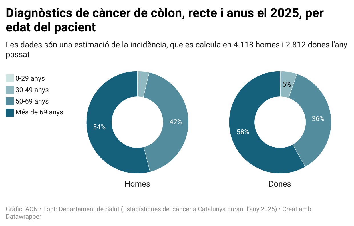 Amb dades del 2025, es calcula que la incidència va ser de 4.118 casos en homes i 2.812 en dones, la majoria de més de 69 anys i entre 50 i 69 anys. Tot i que l’edat és un dels principals factors de risc del càncer de còlon, també es detecten casos en adults joves i els oncòlegs adverteixen que han començat a notar un augment d’aquests diagnòstics a les consultes, que encara no s’ha consolidat als registres poblacionals.