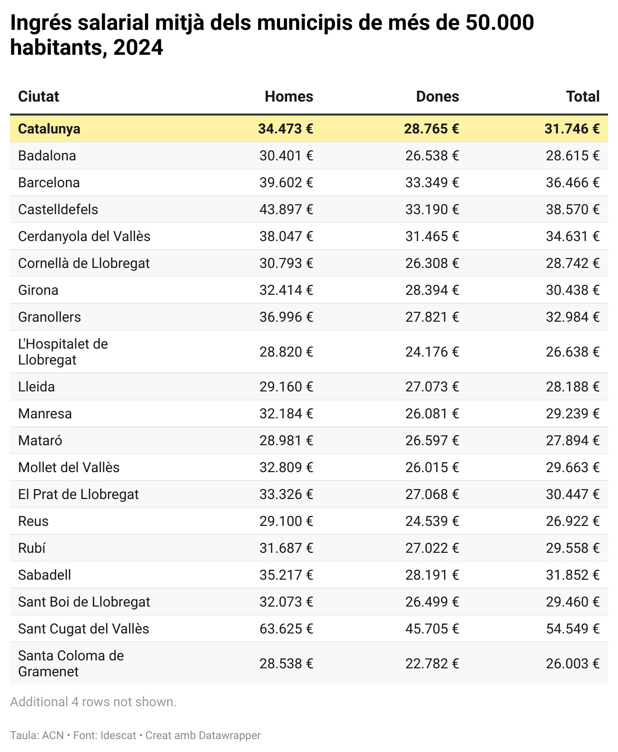 ACN Barcelona – Sant Cugat encapçala la llista d’ingressos salarials de municipis de més de 50.000 habitants a Catalunya amb 54.549 euros bruts el 2024, per davant de Castelldefels (38.570) i Barcelona (36.466), segons l’Estadística de salaris territorial que ha publicat l’Institut d’Estadística de Catalunya (Idescat) aquest dimecres. A l’altre extrem, hi ha Santa Coloma de Gramenet (26.003), l’Hospitalet de Llobregat (26.638) i Reus (26.922). Així doncs, els sous de Sant Cugat superen en més de 15.000 euros el segon de la llista i en més de 28.500 el darrer. L’únic municipi de més de 50.000 habitants que no augmenta el salari brut dels residents respecte a l’any anterior és Manresa, que nota una lleugera disminució del 0,1% (29.239).