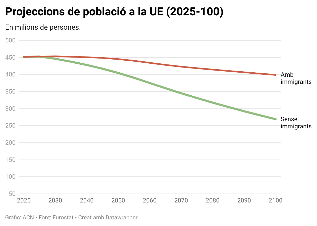 ACN Barcelona – La població de la Unió Europea retrocedirà gairebé un 12% des d’ara fins a final de segle i perdrà 53 milions d’habitants, segons les darreres projeccions de població d’Eurostat. L’oficina estadística comunitària calcula que el nombre d’habitants passarà dels 451,8 milions actuals fins a 398,8 l’any 2100. La davallada seria molt més forta en cas de no comptar amb l’impacte de la immigració, i retrocediria fins a un 40%, és a dir, una pèrdua de 180 milions d’habitants. D’altra banda, Eurostat pronostica un envelliment general de la població i l’allargament de l’esperança de vida, que en el cas de les dones s’elevarà per sobre dels 90 anys (92), i arribarà als 88,4 anys en el cas dels homes.