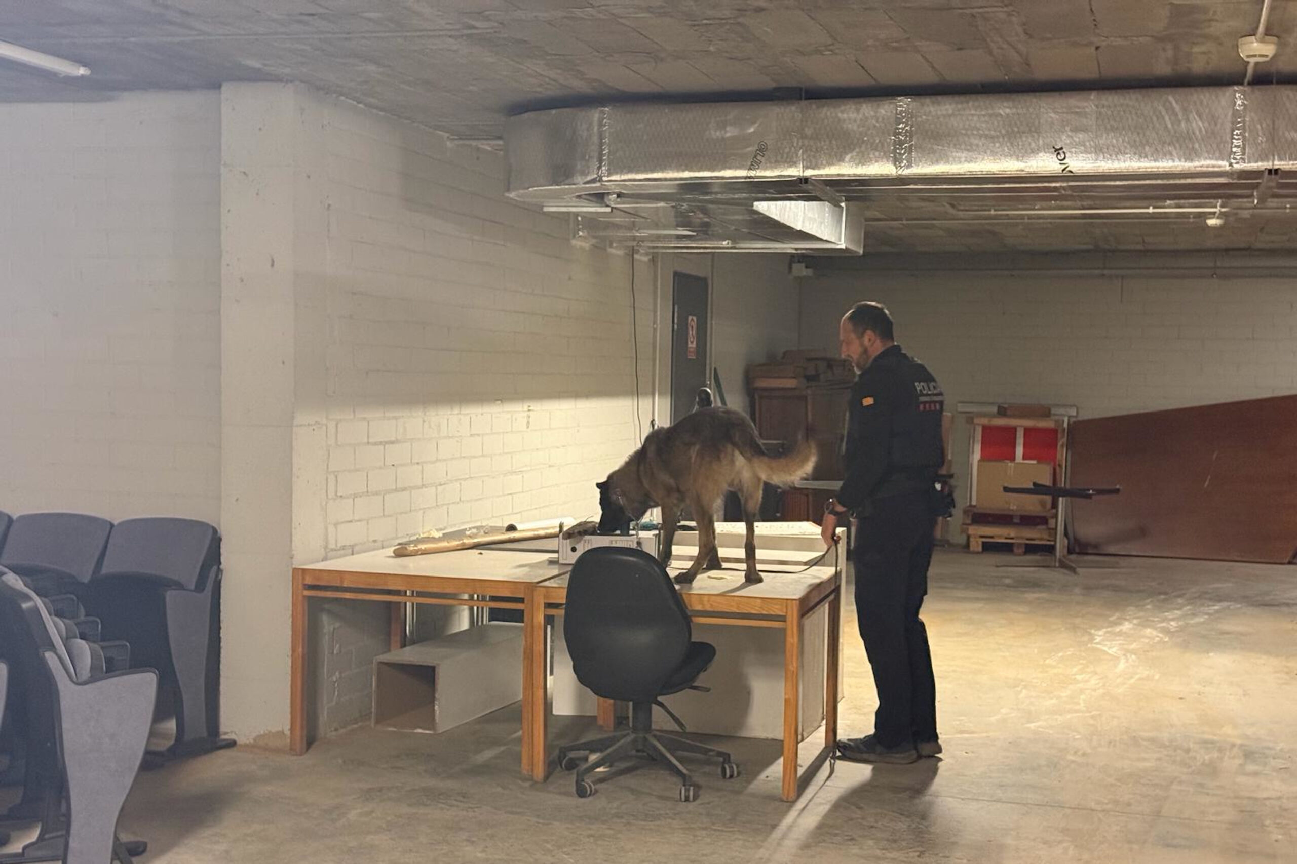 En Kai i el seu guia, un mosso de la canina, comencen un exercici al soterrani de l’Auditori de Girona. L’objectiu és que el gos trobi un explosiu amagat en algun lloc, però ni en Kai ni el mosso que va amb ell saben on és. En qüestió de tres minuts, el gos s’asseu sense moure’s al costat d’un armari. A dins, efectivament, hi ha l’explosiu amagat, la pràctica ha sortit bé.