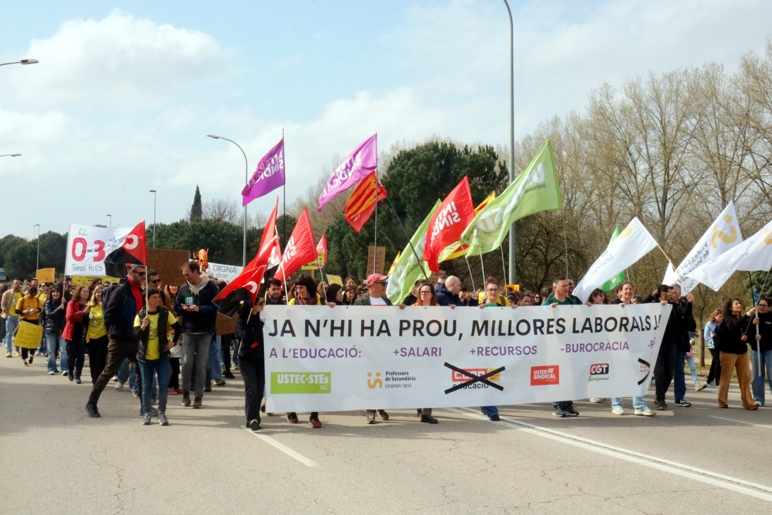 Per altra banda, cap a dos quarts d’onze del matí, han sortit dues columnes de manifestants des d’un extrem i l’altre de la ciutat. Rere la pancarta unitària amb els logotips d’USTEC-STEs, Professors de Secundària (aspepc-sps), la Intersindical i CGT Ensenyament -els de CCOO i la UGT s’han tatxat- les dues marxes han sortit des de Sarrià de Ter (Gironès) i des de la rotonda de l’Avellaneda.
