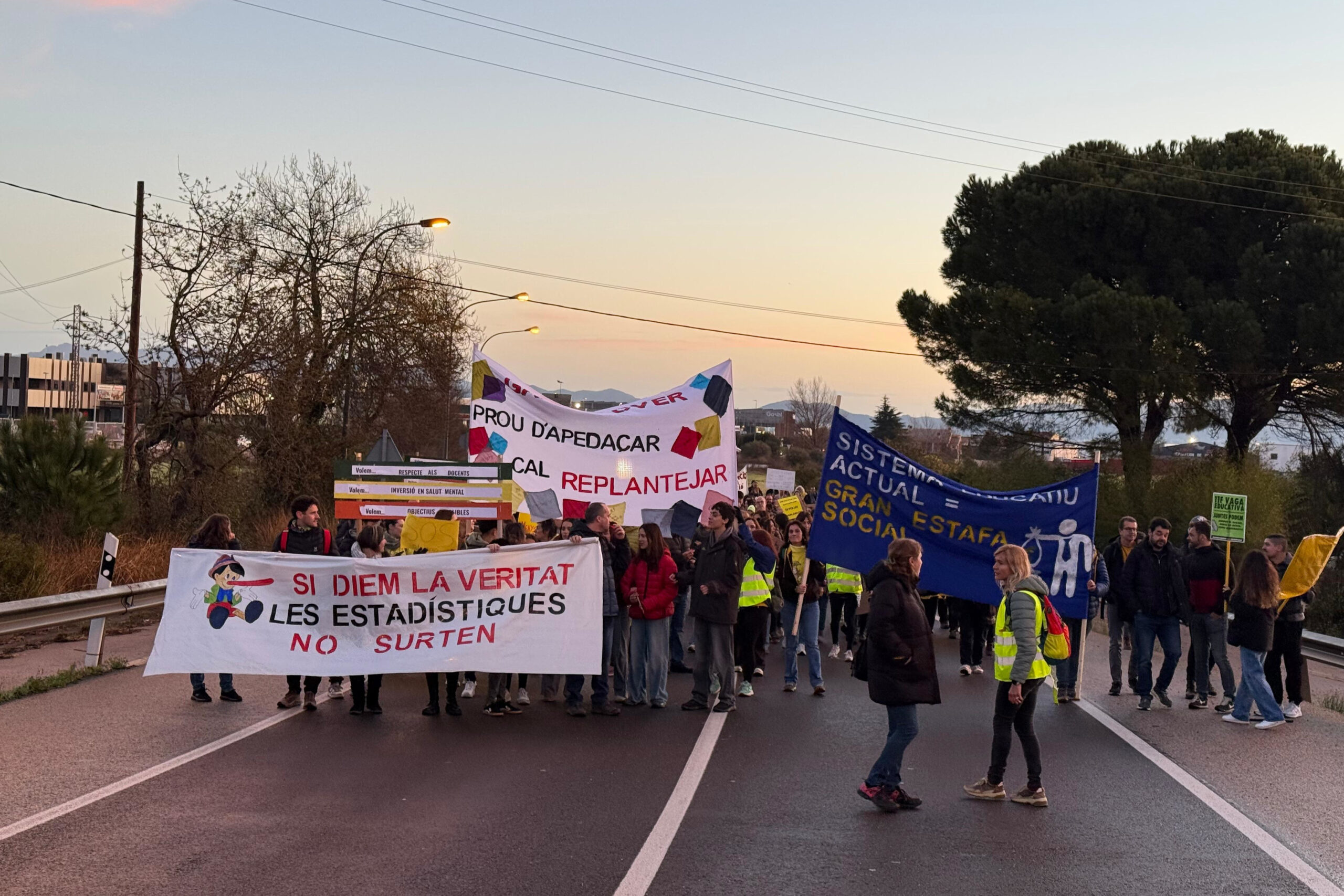 A dos quarts de vuit del matí uns 300 docents han començat a recórrer els prop de 400 metres que hi ha entre la rotonda de Santa Llogaia d’Àlguema amb la de Borrassà, a l’Alt Empordà. Un cop han arribat en aquest nus de comunicacions -aquí enllaça l’N-II, la C-26, l’N-260 i l’autopista- els Mossos han tallat els accessos i ha començat la protesta per reclamar una millora de les condicions, tant de sou com de recursos a les aules. Tot plegat, dins del marc de la jornada de vaga convocada pel sector educació.